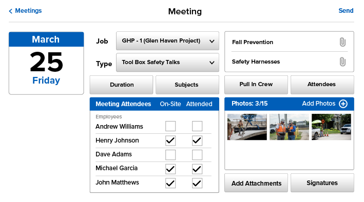 Run meetings easily in the field with talking points for the day’s safety topics, quick attendee logs, and photo uploads.